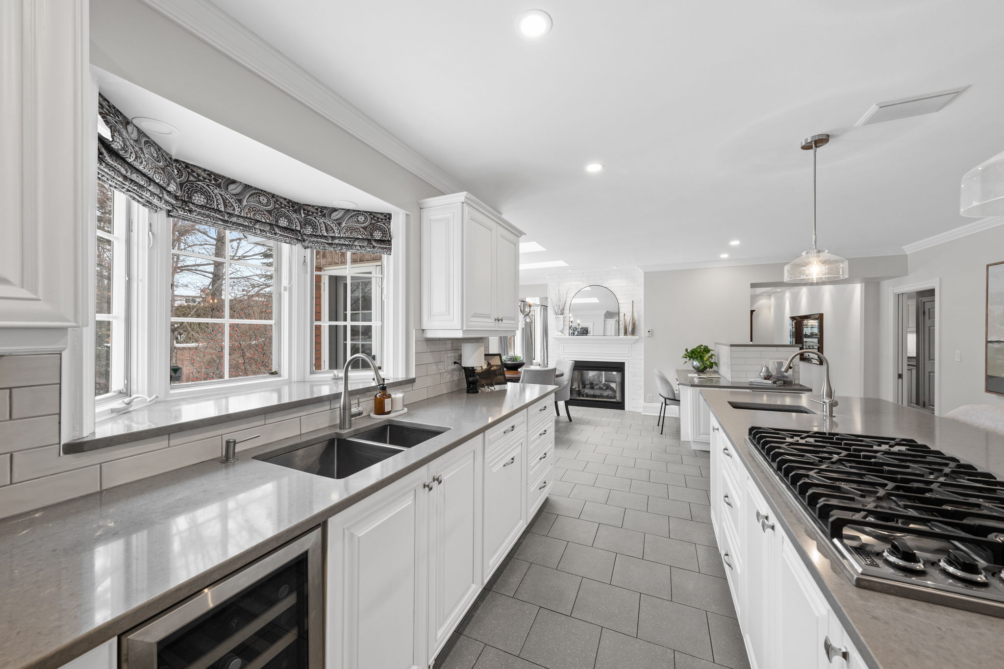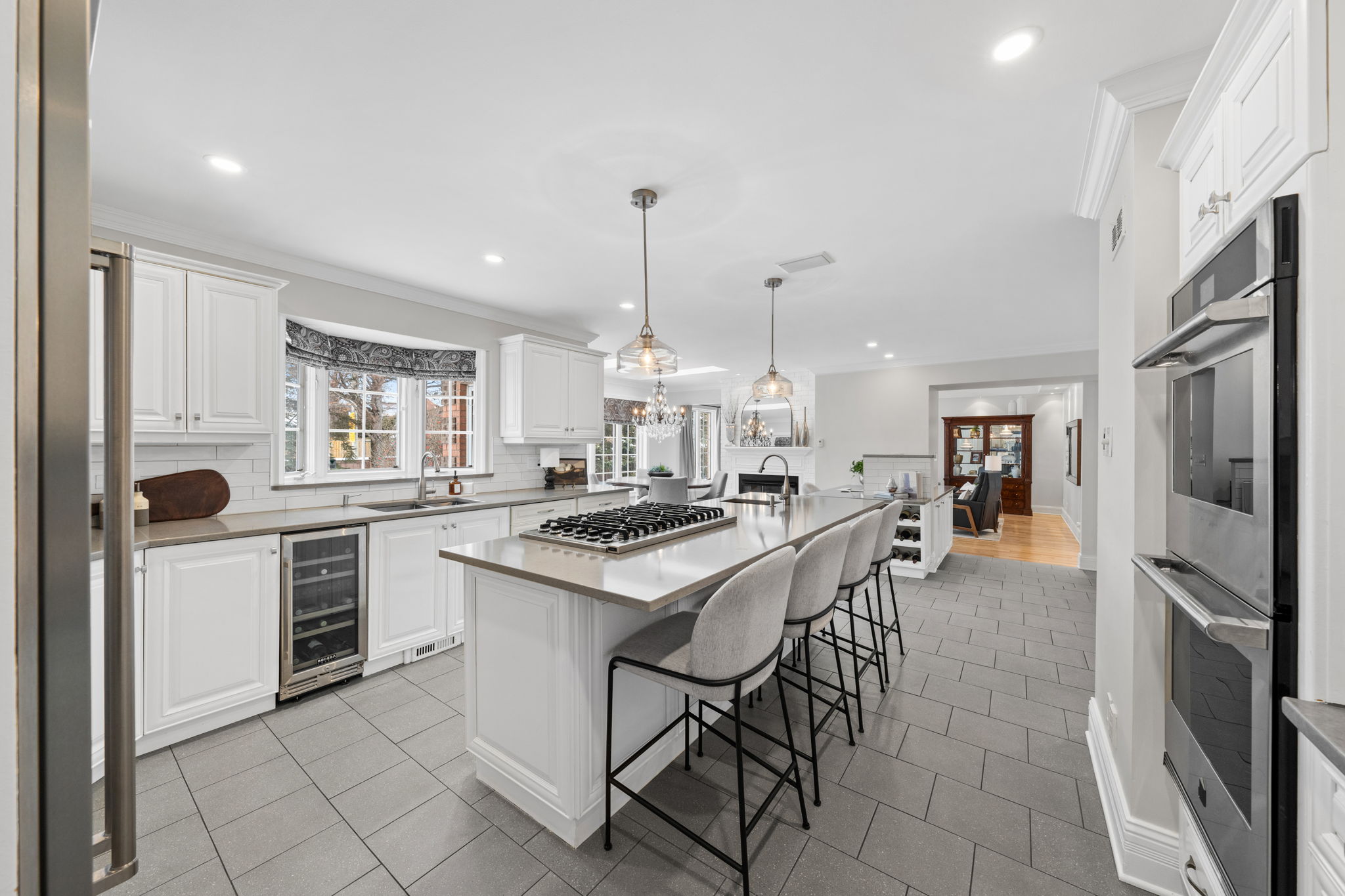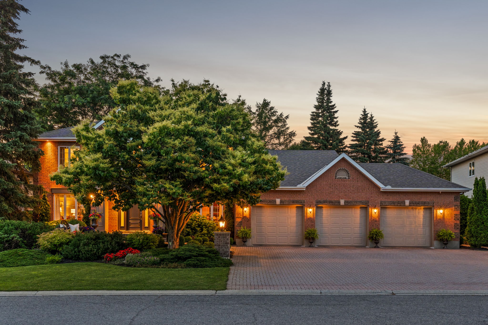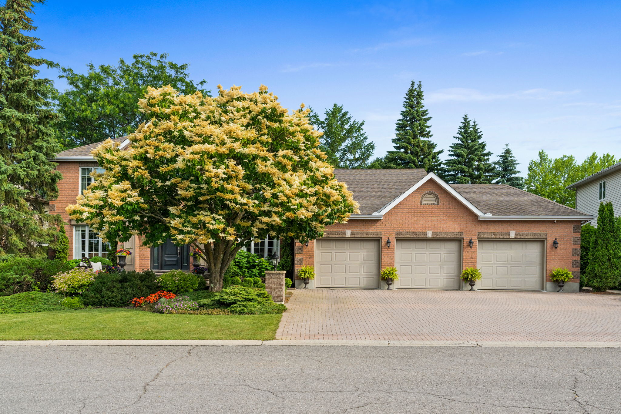 Upon entry, you are welcomed by a stunning hardwood staircase & a classic cross-hall design, unveiling a gracious den, formal living room, & intimate dining room accented by French doors-perfectly curated for both entertaining & everyday living. The heart of the home showcases a spectacular chef’s kitchen featuring an oversized island, premium appliances, & an impressive walk-in pantry. The adjoining breakfast area is warmed by a striking double-sided fireplace & provides seamless access to the breathtaking backyard oasis, creating an effortless flow for indoor-outdoor living. Just off the kitchen, the beautifully appointed great room is inundated with natural light, offering a welcoming space to unwind or entertain family & friends. A highly functional mudroom and laundry area feature expansive quartz countertops, abundant storage, & a full refrigerator & freezer, leading seamlessly to the impressive three-bay garage complete with newly epoxied floors and fresh paint.The upper level offers three generously proportioned bedrooms & a serene primary suite retreat, highlighted by a luxurious ensuite featuring a custom oversized shower and freestanding soaker tub-designed to deliver a spa-inspired experience. A beautifully renovated main bathroom completes this level, blending timeless style with custom finishes. The thoughtfully finished lower level features a welcoming family room centred around a cozy gas fireplace, an additional bedroom, a newly renovated bathroom, & abundant storage-creating a versatile and refined space, perfect for guests or an in-law suite.