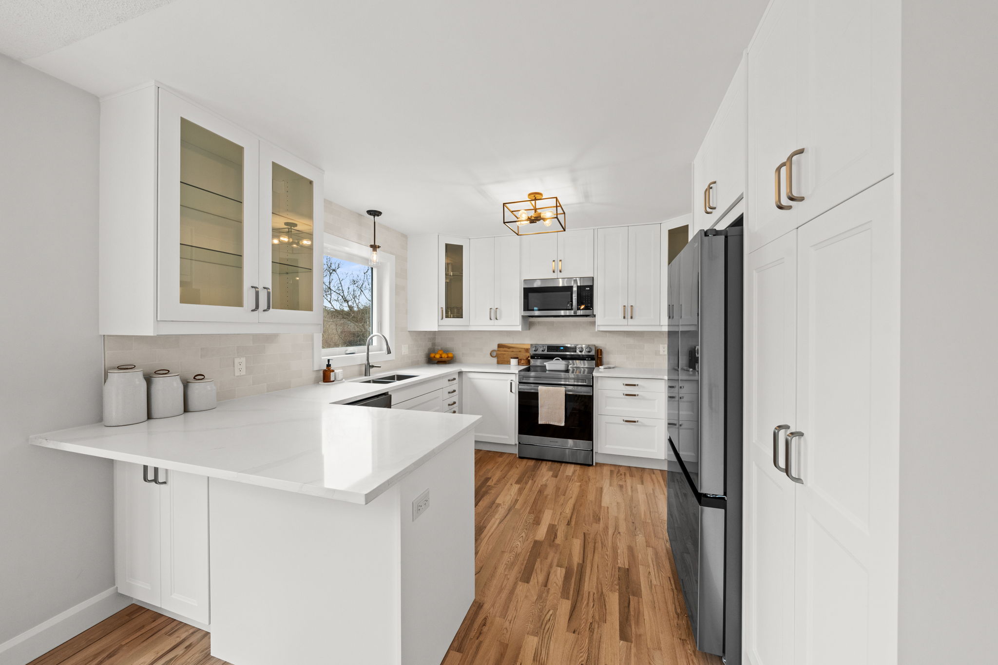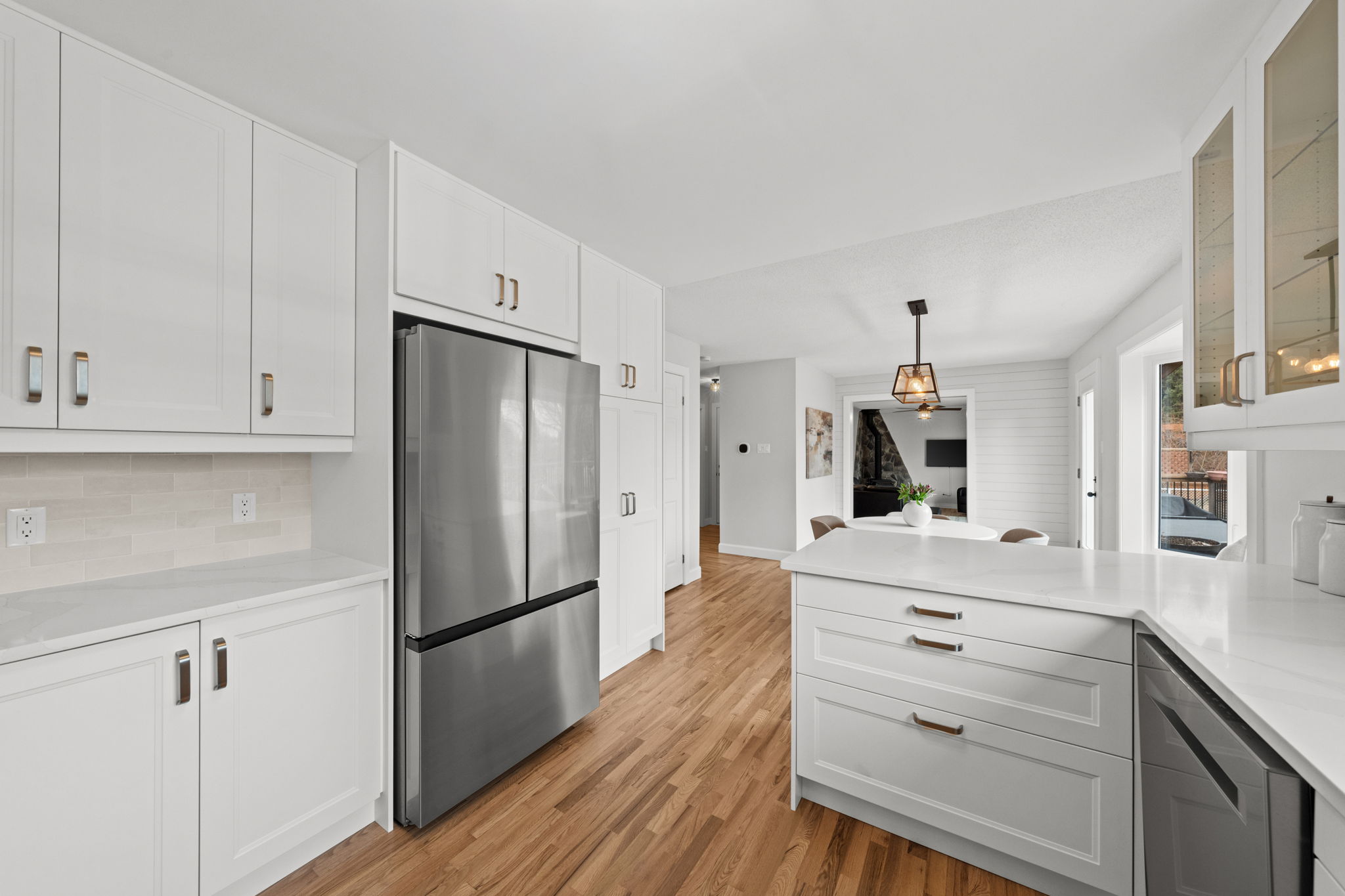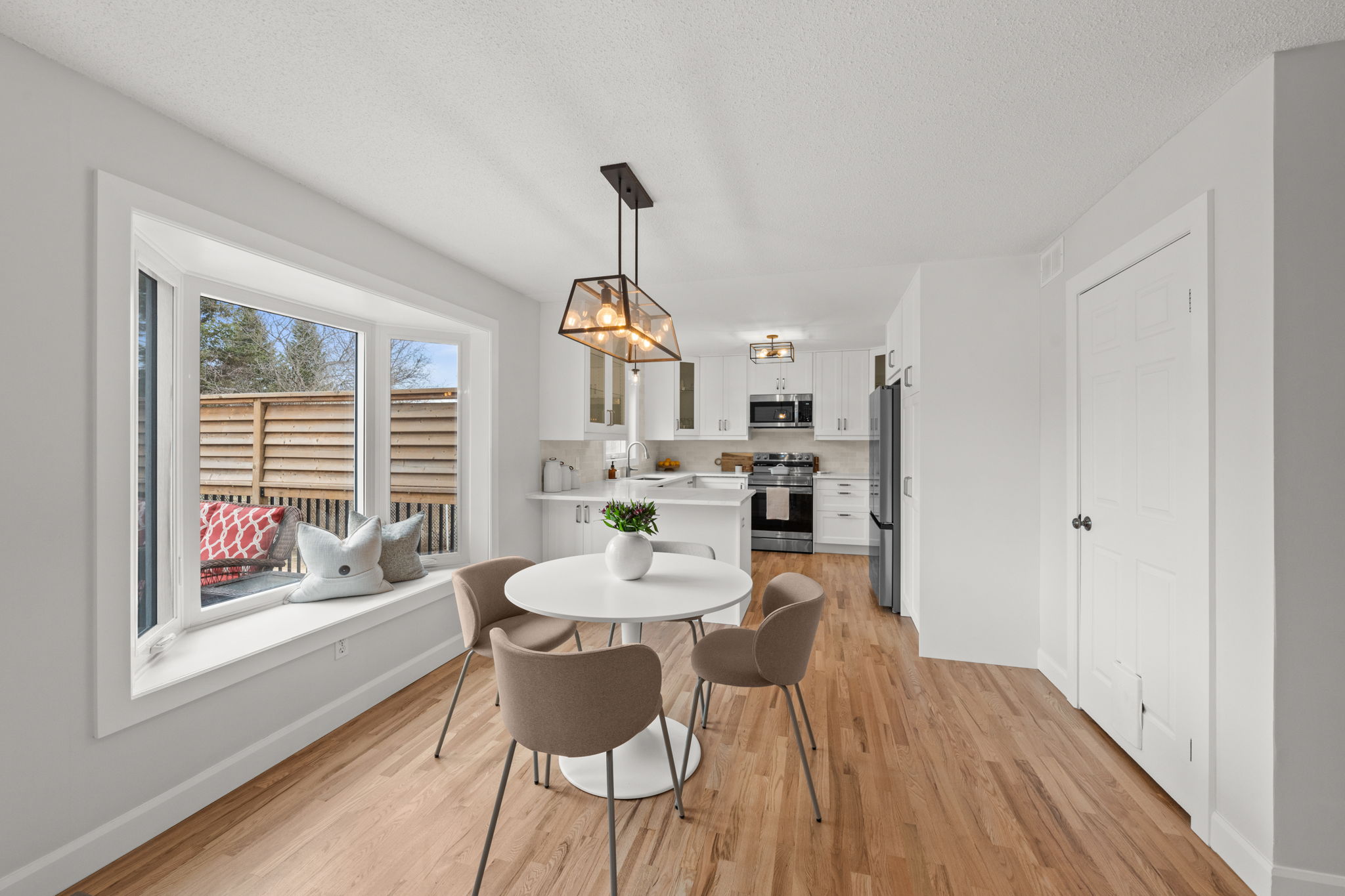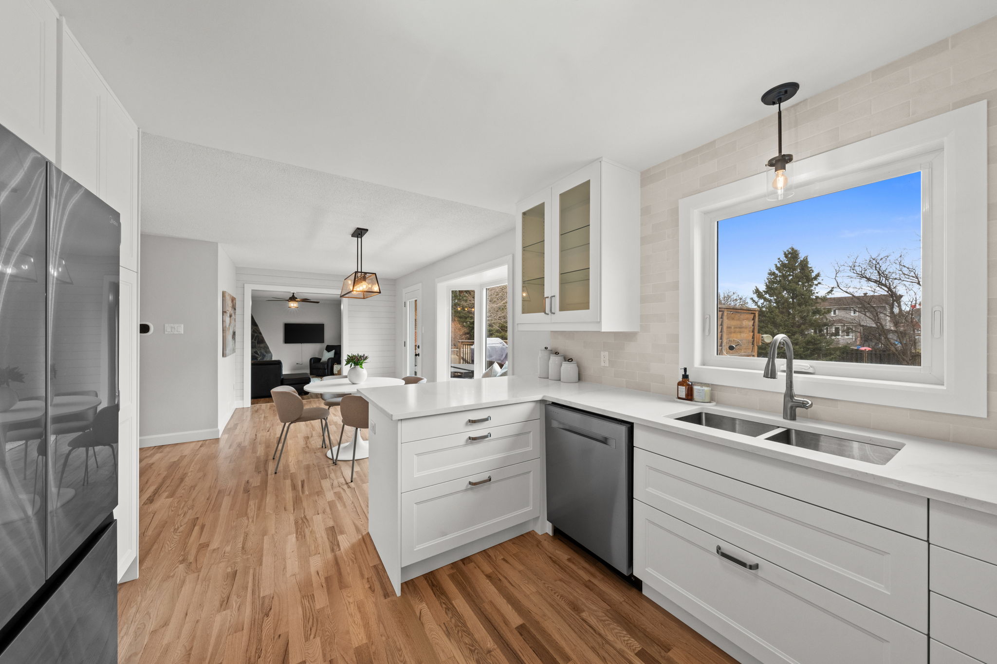 Upon entering, you are greeted by newly refinished hardwood floors & a bright, contemporary feel that carries throughout the home. Oversized newer windows & doors flood the home with natural light, while a soft, neutral palette enhances the home’s refined & cohesive aesthetic. The stunning custom-designed kitchen immediately captures your attention, featuring quartz countertops, stainless steel appliances, & a sophisticated backsplash, an elegant space designed for both everyday living & effortless entertaining. A cozy dining area just off the kitchen offers beautiful views of the backyard & direct access outdoors, creating a seamless indoor-outdoor lifestyle. The kitchen flows effortlessly into the warm & inviting living room, anchored by a cozy wood stove, perfect for relaxed evenings. The main floor also offers a lovely formal dining room, easily adaptable as a den or home office, along with the added convenience of a main floor laundry closet & direct access to the double car garage. The upper level features a generous primary retreat with a walk-in closet, complemented by two additional well-proportioned bedrooms & a well-appointed main bathroom.