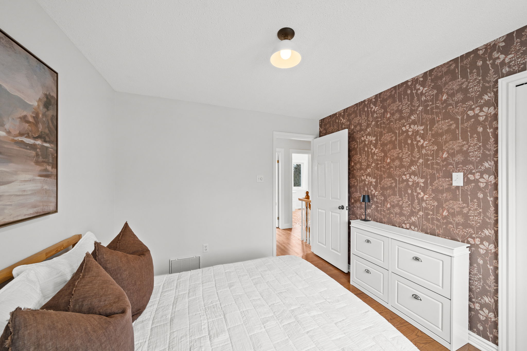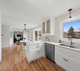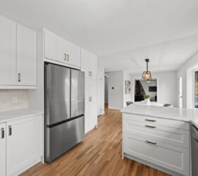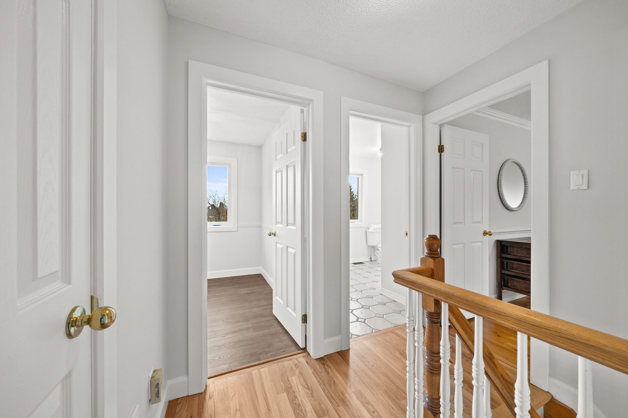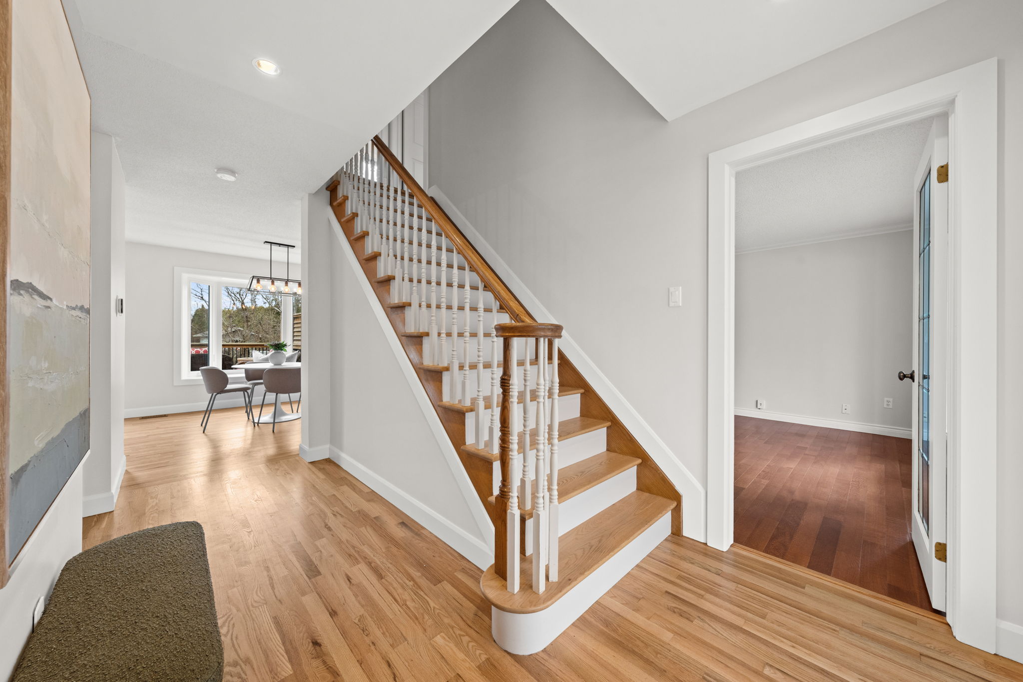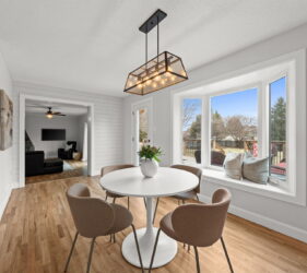 Upon entering, you are greeted by newly refinished hardwood floors & a bright, contemporary feel that carries throughout the home. Oversized newer windows & doors flood the home with natural light, while a soft, neutral palette enhances the home’s refined & cohesive aesthetic. The stunning custom-designed kitchen immediately captures your attention, featuring quartz countertops, stainless steel appliances, & a sophisticated backsplash, an elegant space designed for both everyday living & effortless entertaining. A cozy dining area just off the kitchen offers beautiful views of the backyard & direct access outdoors, creating a seamless indoor-outdoor lifestyle. The kitchen flows effortlessly into the warm & inviting living room, anchored by a cozy wood stove, perfect for relaxed evenings. The main floor also offers a lovely formal dining room, easily adaptable as a den or home office, along with the added convenience of a main floor laundry closet & direct access to the double car garage. The upper level features a generous primary retreat with a walk-in closet, complemented by two additional well-proportioned bedrooms & a well-appointed main bathroom.
